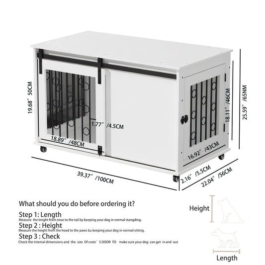 Dog Crate With Sliding Barn Door And Side Access, Lockable Wheels For Small To Medium Dogs - White