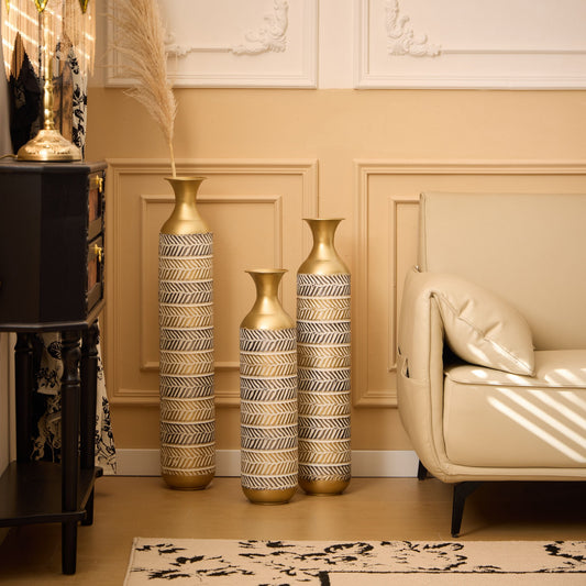 Metal Decorative Vase High Distress Metal Center Vase With 3D Triangle Pattern, (Set of 3) Vases For Home Decoration - Gold