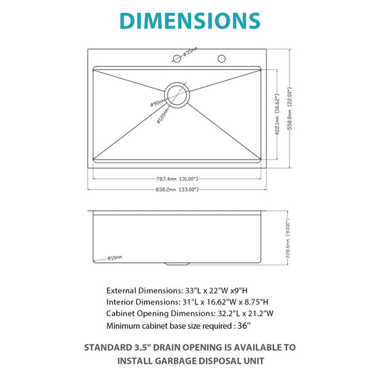 32" Undermount Kitchen Sink With, Single Bowl - Brushed Nickel