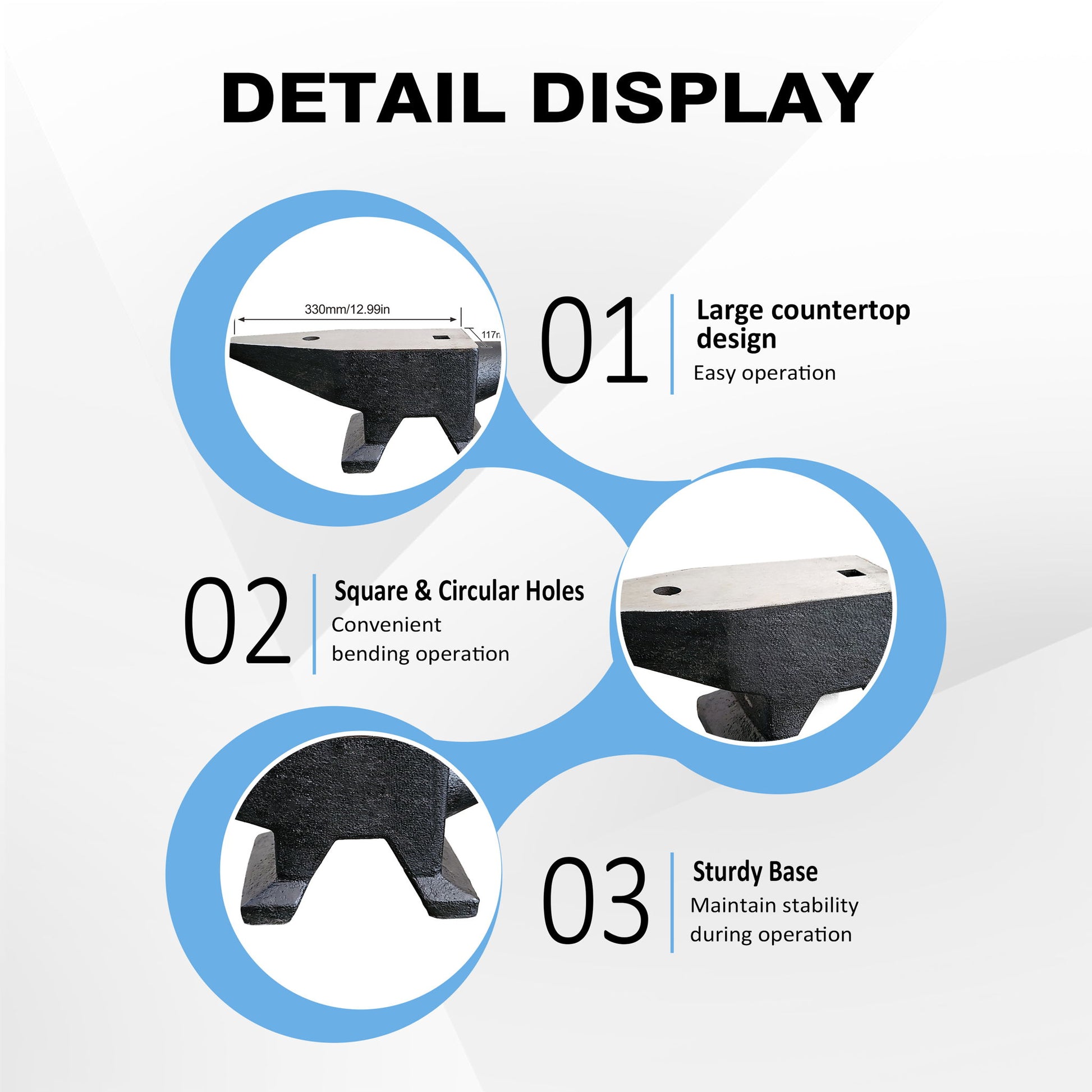 Surface Treatment: The anvil has a completely polished surface area with excellent quenching treatment, achieving a hardness of up to HRC55, along with corrosion and rust resistance.