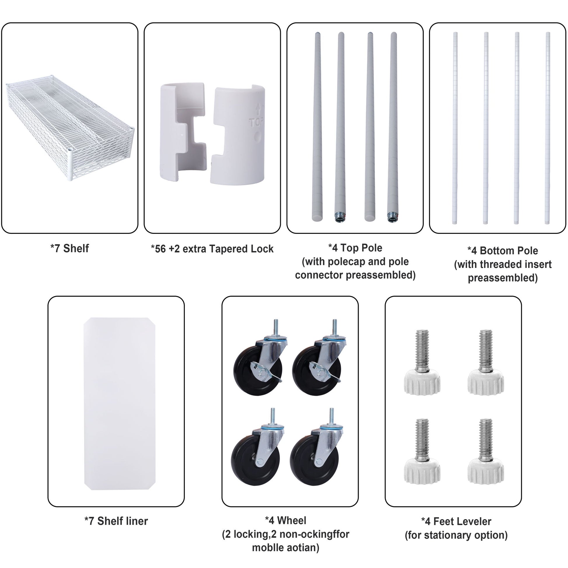 7 Tier Metal Shelf Wire Shelving Unit, 2450Lbs Heavy Duty Adjustable Storage Rack With Wheels & Shelf Liners For Closet Kitchen Garage Basement Commercial Shelving - White18.0"W x 48.0"D x 81.5"H - 56.0 lb