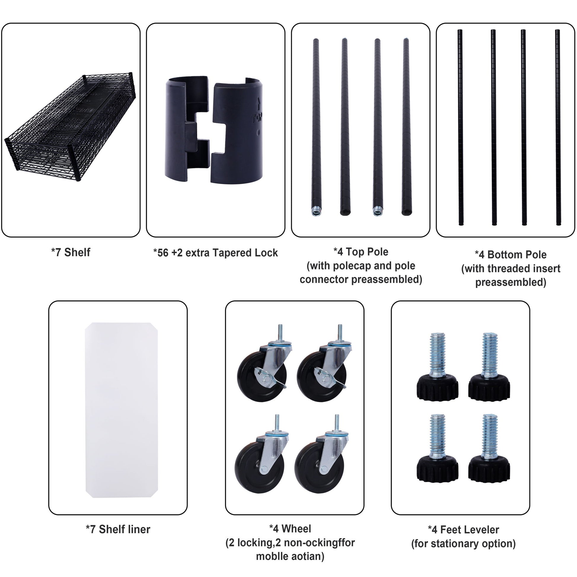 7 Tier Metal Shelf Wire Shelving Unit, 2450Lbs Heavy Duty Adjustable Storage Rack With Wheels & Shelf Liners For Closet Kitchen Garage Basement Commercial Shelving - Black18.0"W x 48.0"D x 81.5"H - 56.0 lb