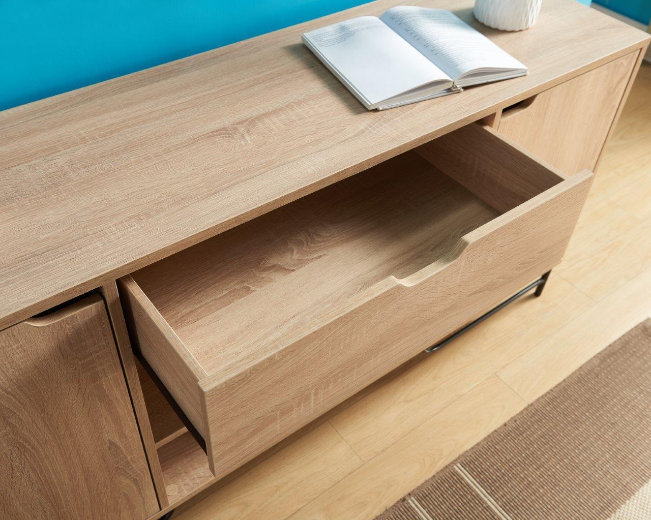 Storage Options: This buffet offers ample storage with two open shelves, two side cabinets featuring two shelves each, and one drawer, allowing you to organize and access your items easily.