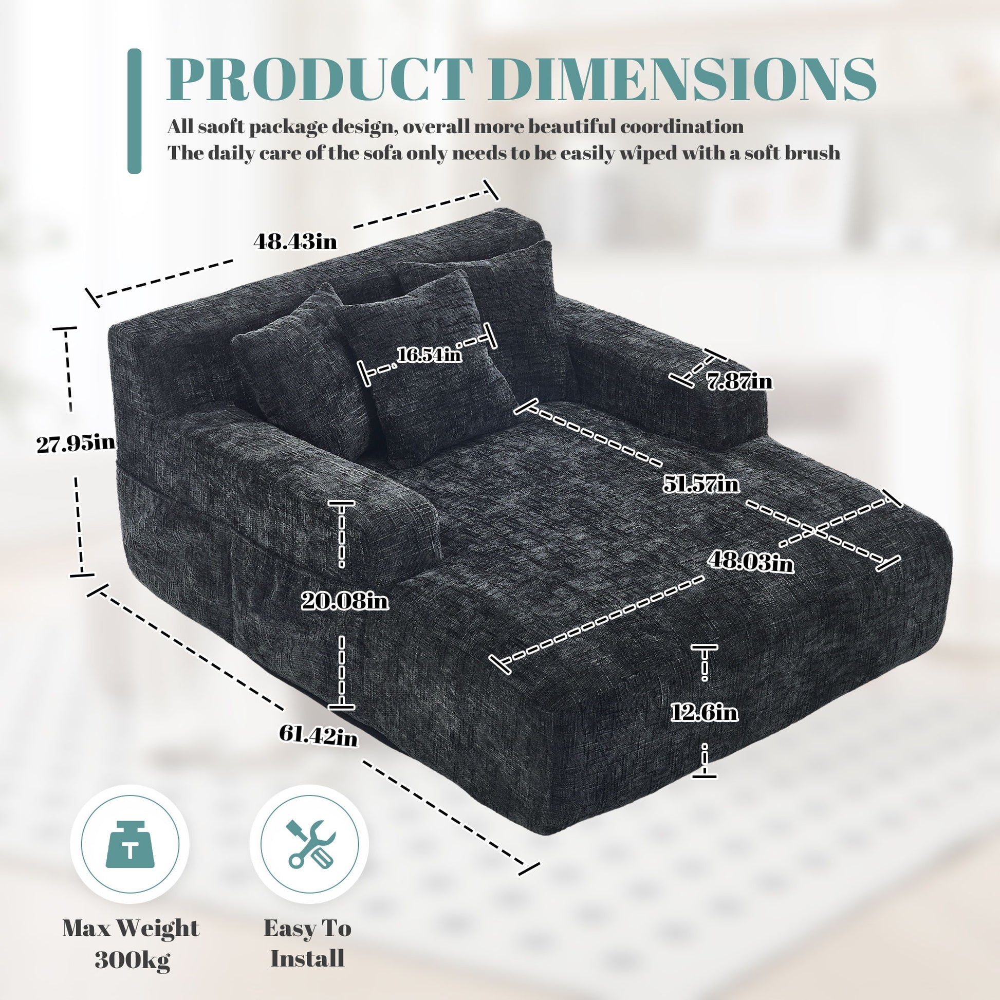 Chenille Interior Lazy Sofa Chaise Lounge Armchair With 3 Pillows And Armrests, Soft Chenille - Black61.42"W x 48.43"D x 27.95"H - 85.8 lb