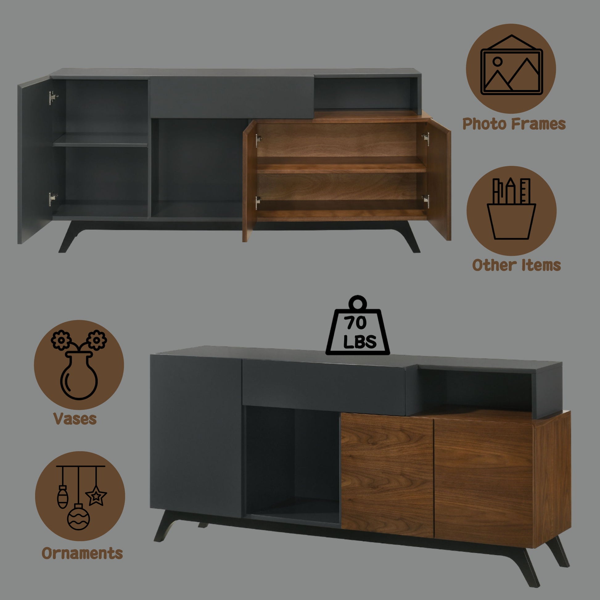 • Elegant Design: This server features a sophisticated walnut finish with a two-tone design, adding depth and visual interest to any dining area.