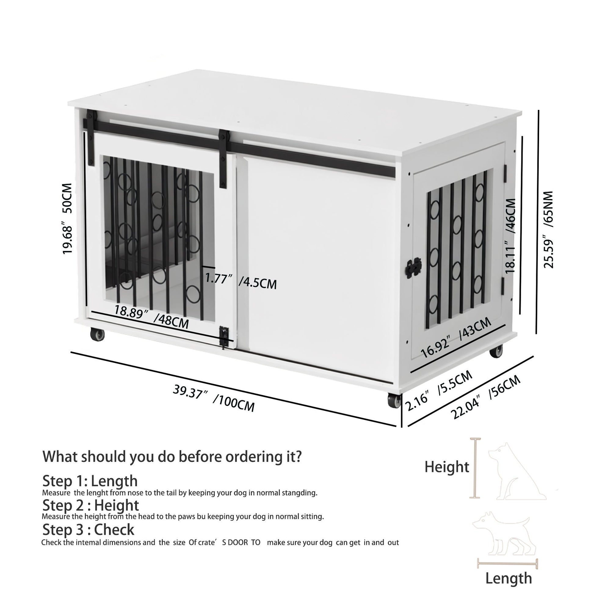 Dog Crate With Sliding Barn Door And Side Access, Lockable Wheels For Small To Medium Dogs - White39.37"W x 22.05"D x 25.59"H - 53.02 lb