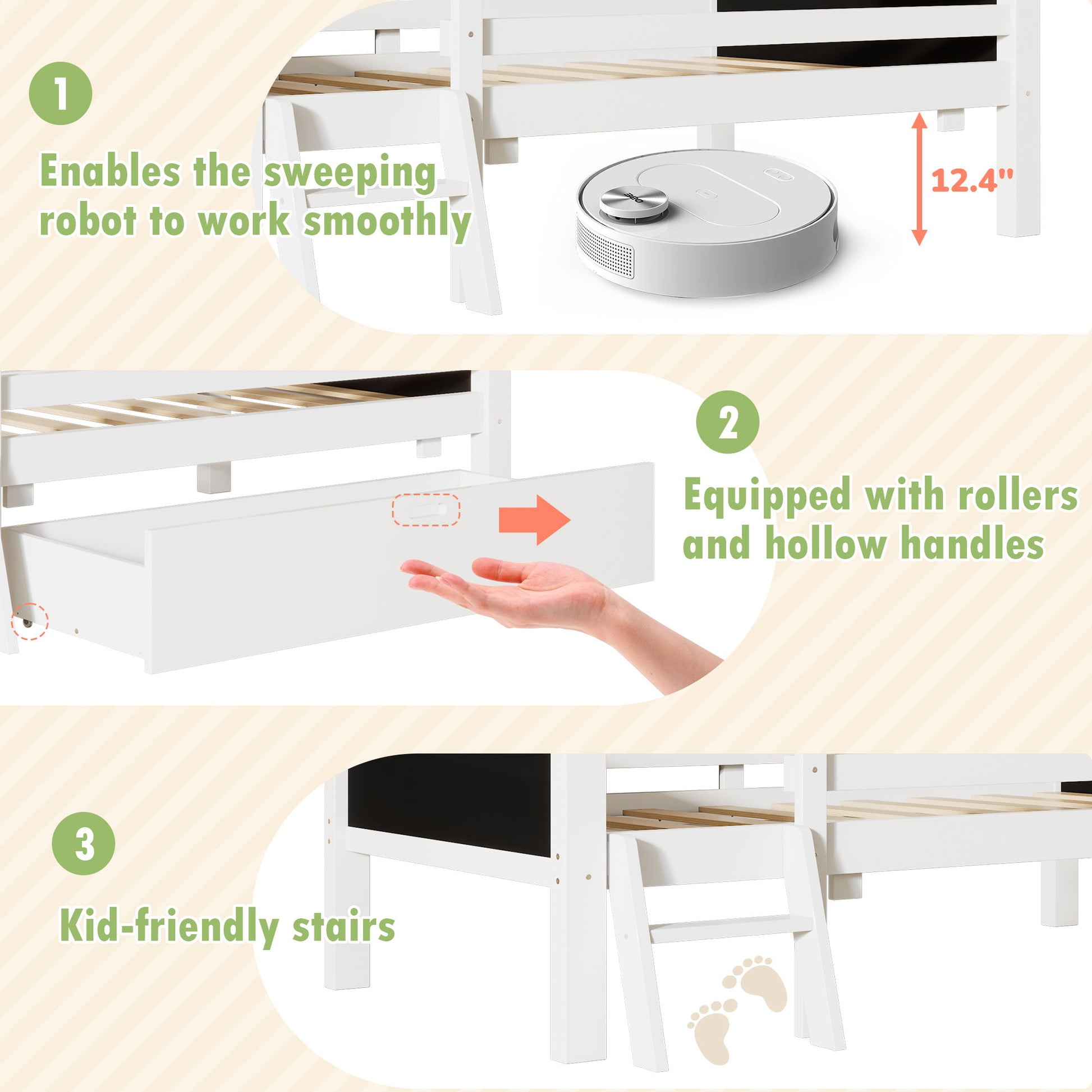 Twin Size House Bed With Ladder, Storage Drawers, And Blackboard Design - White79.0"W x 47.3"D x 66.0"H - 87.08 lb