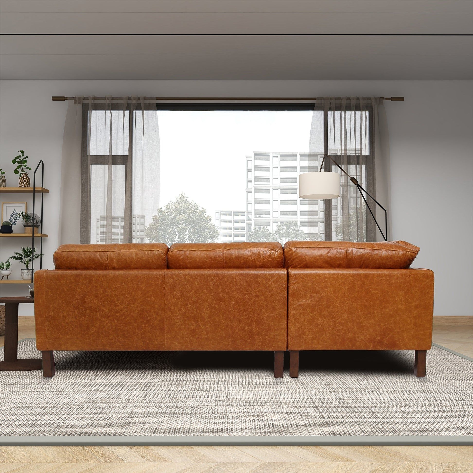 Elegant Design: The Juno Sectional Leather Sofa combines sophistication and elegance, featuring a rich wax and oil finish with 100% buffalo aniline-dyed leather upholstery that highlights color variations for a distinctive, classic style.