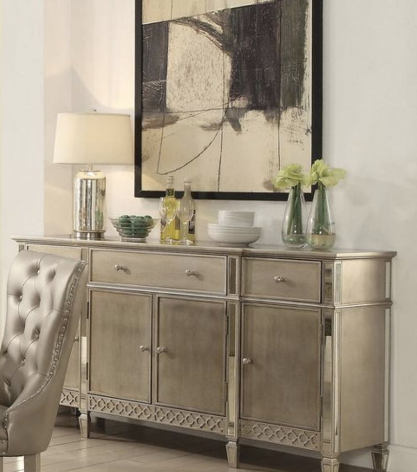 • Elegant Design: This server boasts a mirrored and champagne finish, exuding sophistication and elegance in any dining or living space. Its rectangular design with a wooden top and geometric apron-base trim provides a timeless look.