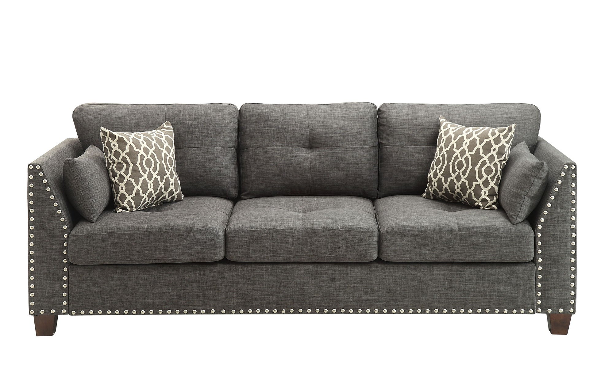 • Elegant Design: This light charcoal linen sofa showcases a sophisticated look with buttonless tufted back and seat cushions, adding to its luxurious appeal. The sleek, flared armrests adorned with nailhead trim provide refined detail, enhancing the sofa's elegance.