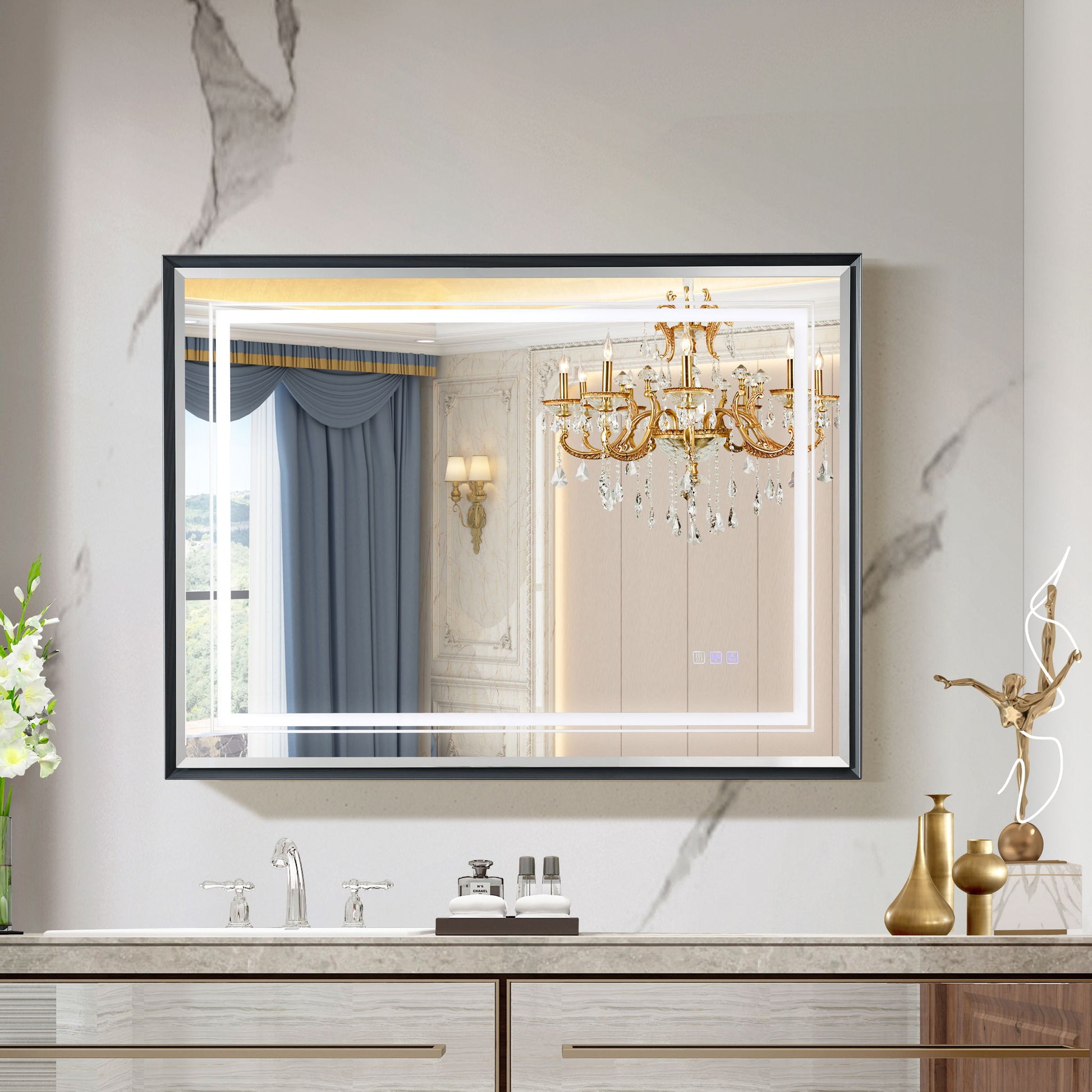 Elegant Design: Featuring smooth aluminum frame lines and a three-dimensional beveled edge lens, this mirror enhances the bathroom's ambiance with front and side lighting, creating a sophisticated double-layer lighting effect.