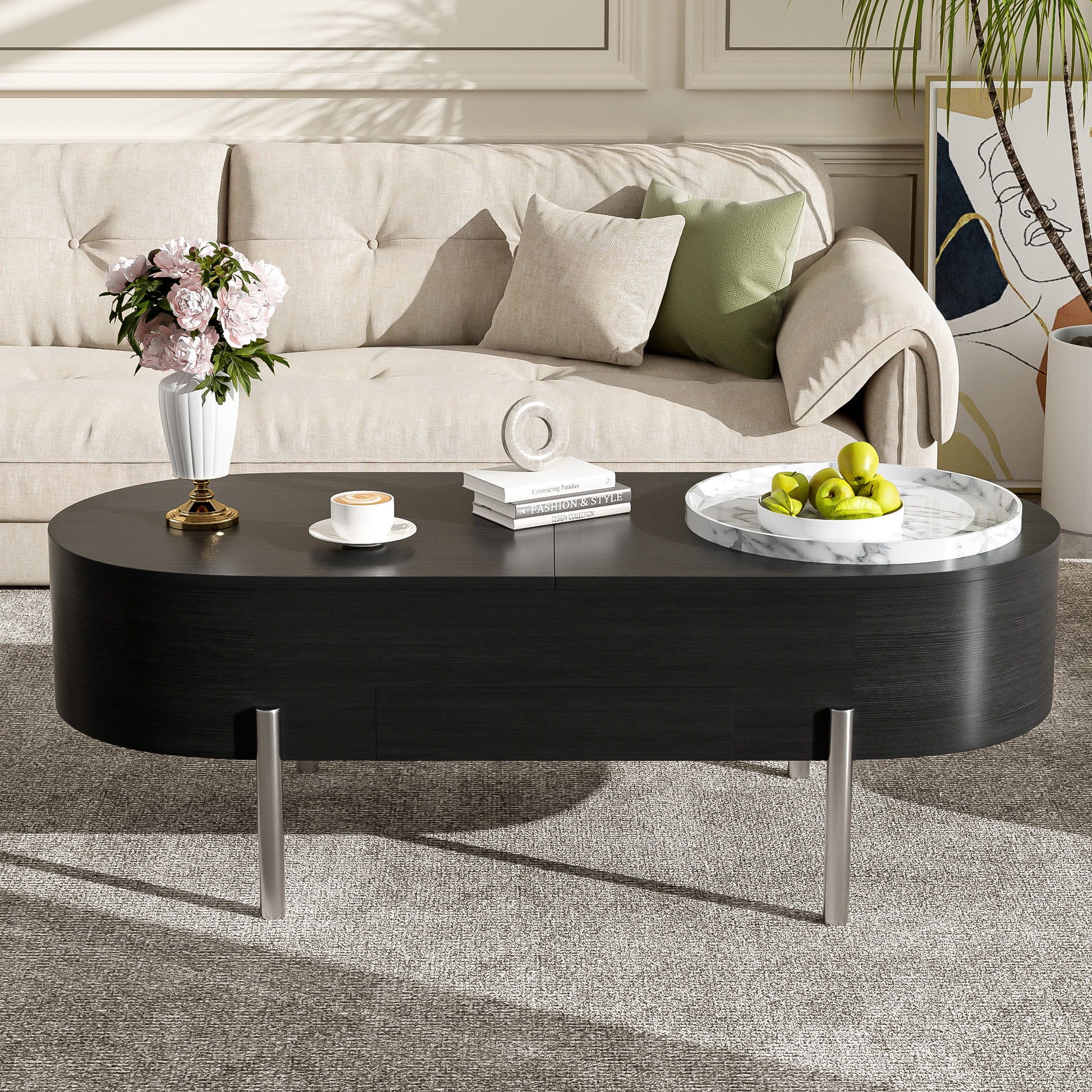 Lift Top Coffee Table With 360 Degree Marble Patterned Rotating Tray, Hidden Compartment, Partially Assembled Wooden Center Table, Modern Oval Lift Tabletop For Home Living Room - Black47.2"W x 19.6"D x 16.1"H - 62.83 lb