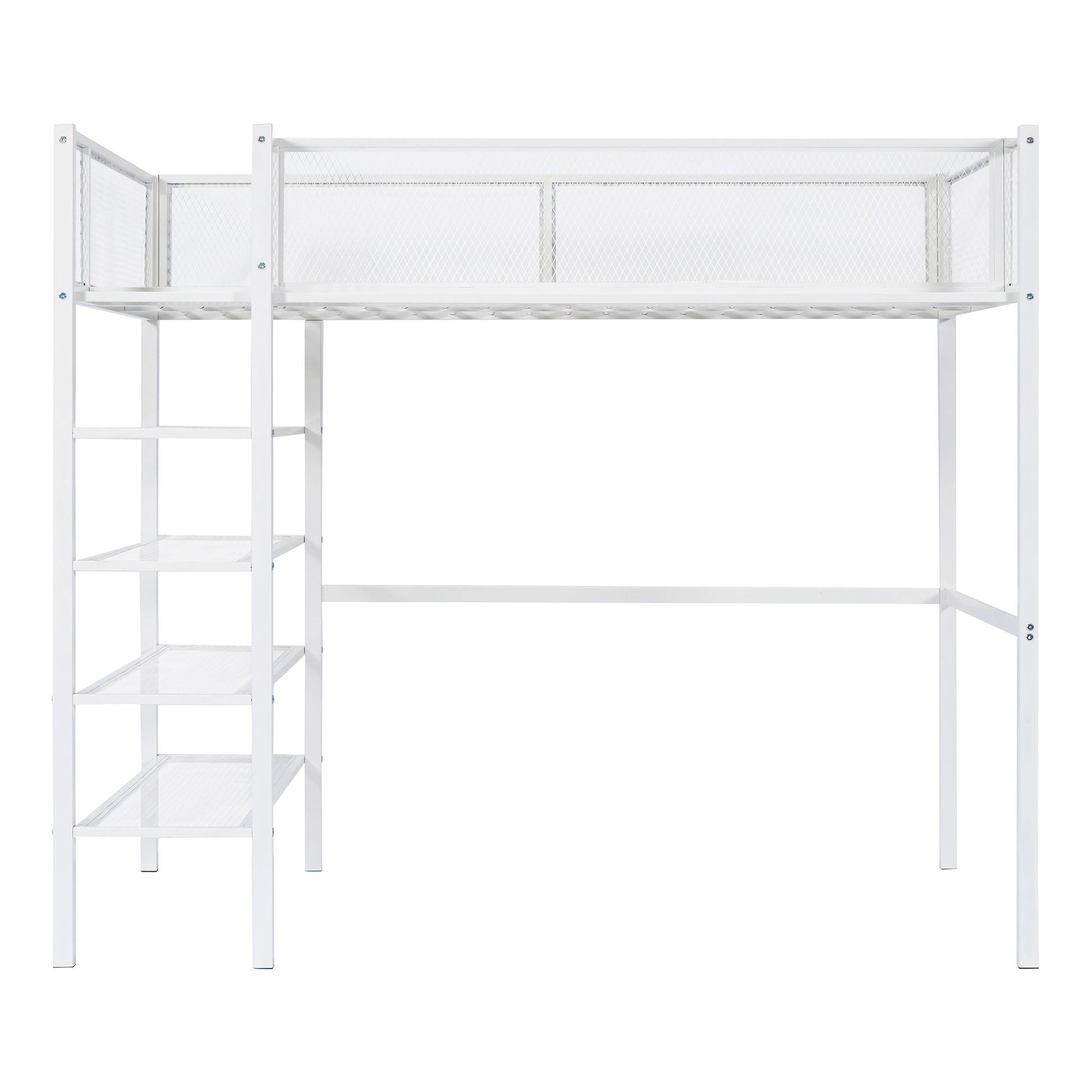 This metal loft bed with storage space is made from sturdy metal and features a clean-cut silhouette that complements any room decor. It includes 4-tier open shelves and a storage shelf beside the bed guardrail, making it easy to grab items without getting out of bed. With this collection, you can transform any space into a workstation, reading nook, or lounge area.