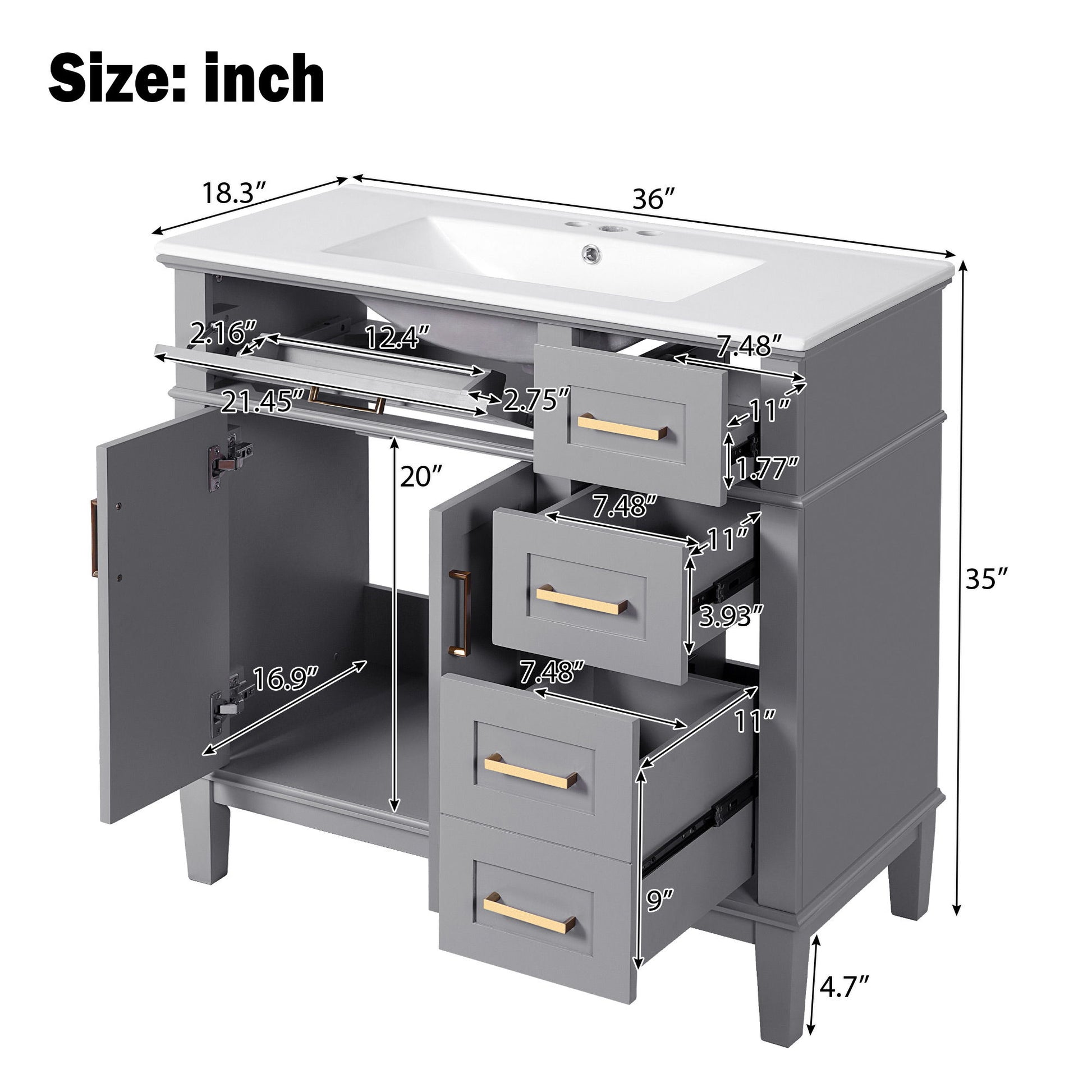 Bathroom Vanity With Sink, Soft Close Doors, And Storage Drawers - Gray18.3"W x 36.0"D x 35.0"H - 108.91 lb