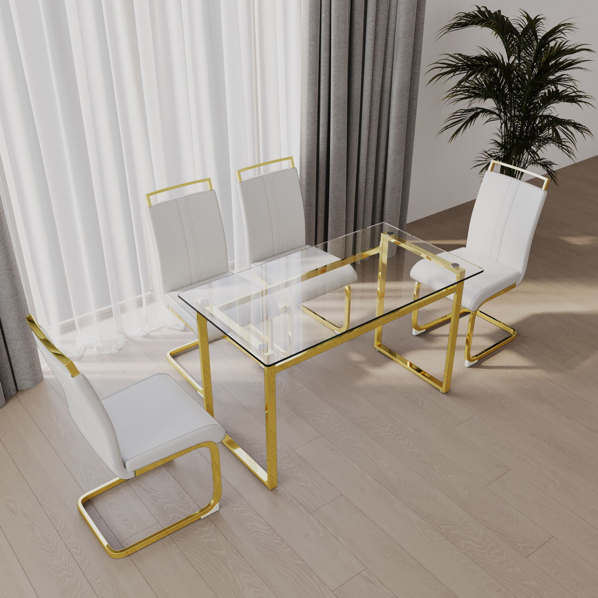 Modern Glass Dining Table Set For 4 With Golden Plating Legs And Chairs - Transparent