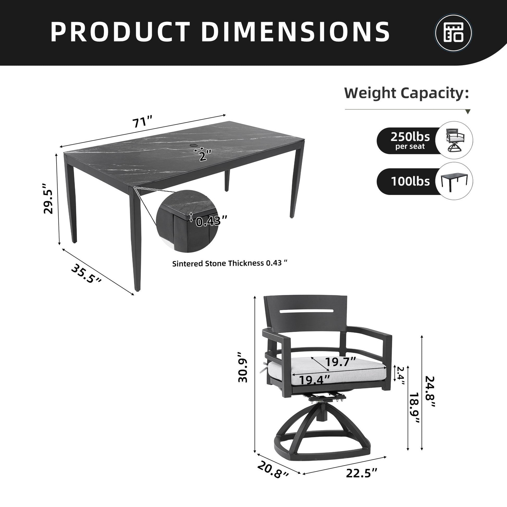 Tabletop: Crafted from high-quality sintered stone, offering luxurious aesthetics, durability, and weatherproof performance.