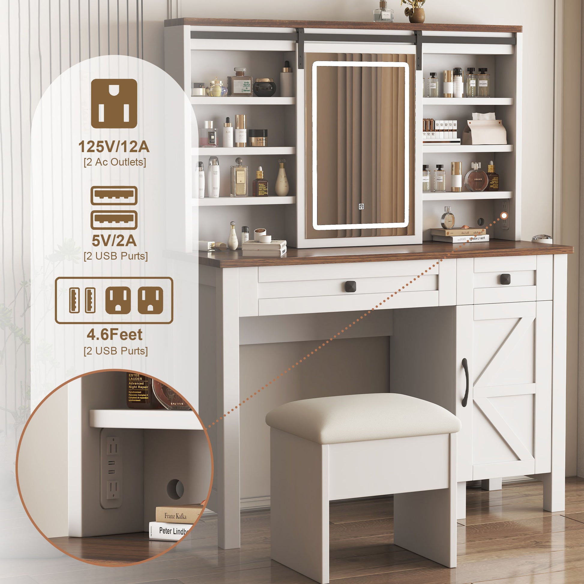 Rustic Farmhouse Makeup Vanity Desk With Sliding Mirror, LED Lights, And Charging Socket - White42.13"W x 15.75"D x 53.94"H - 106.92 lb