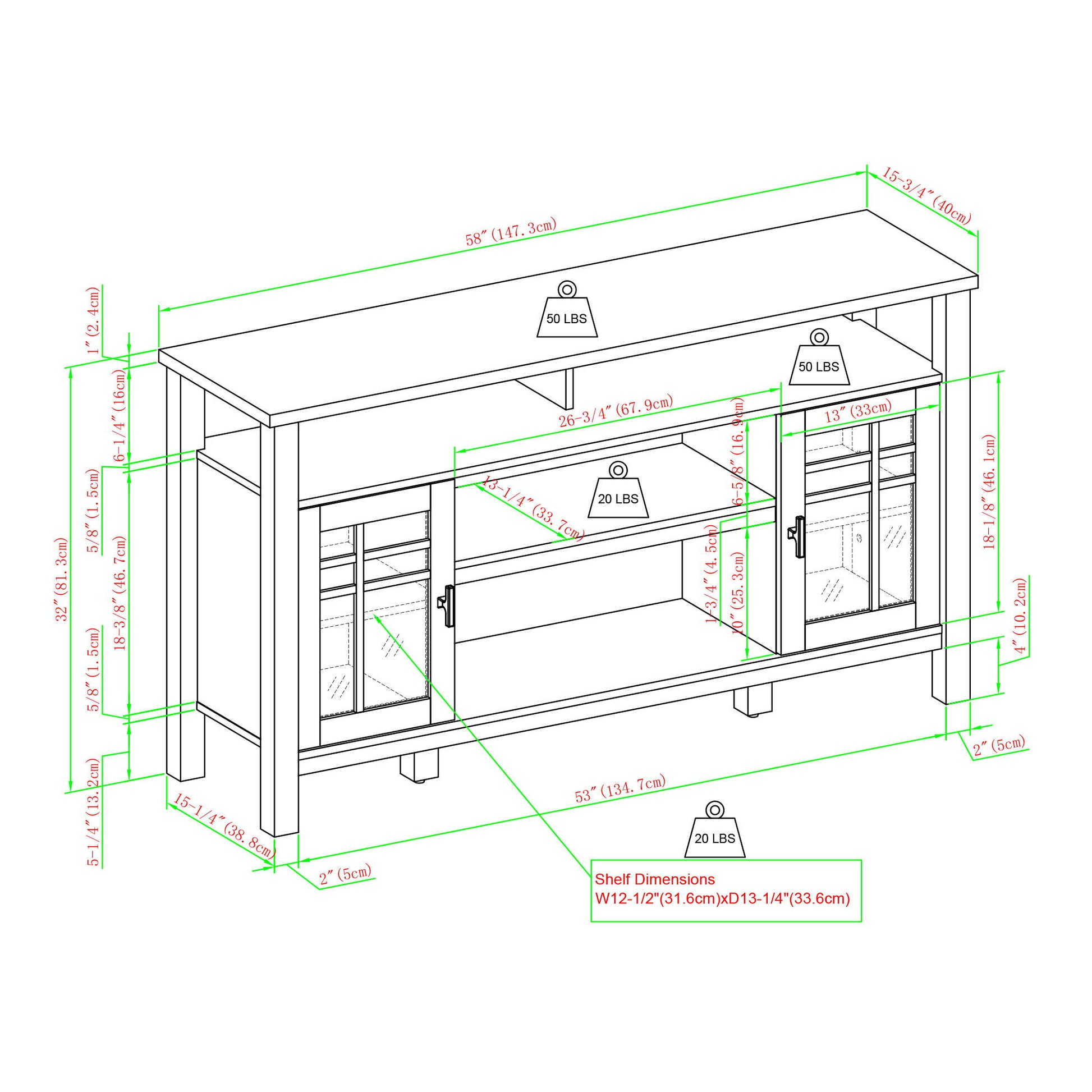58.0"W x 15.75"D x 32.0"H - 93.0 lb