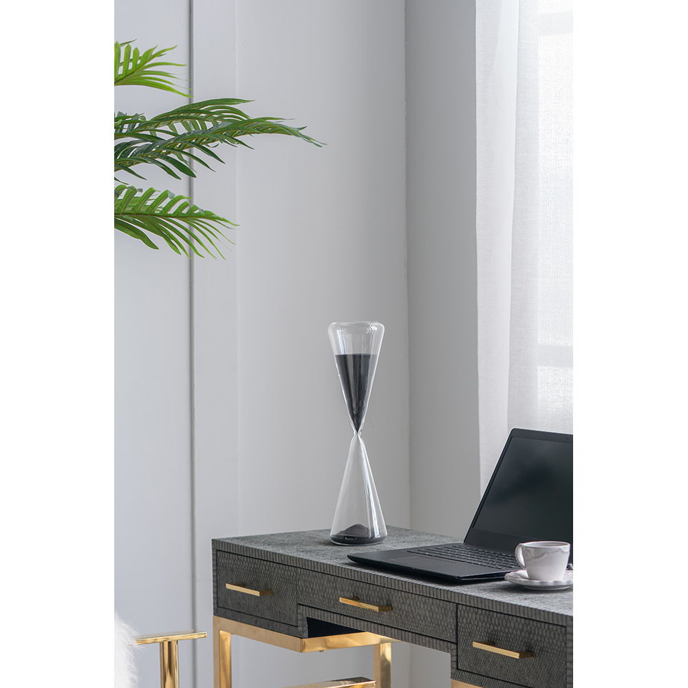 Elegant Design: Eye-catching hourglass with black sand resting on a sleek crystal stand.