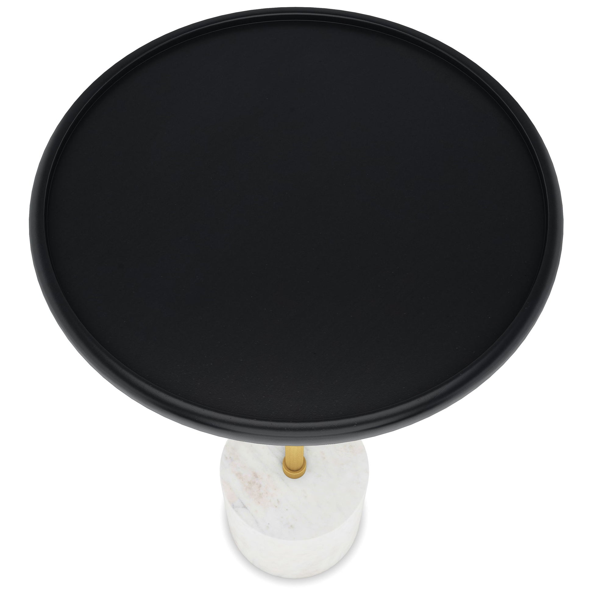 • Features round solid mango wood top, antique brass look stem and solid white marble base