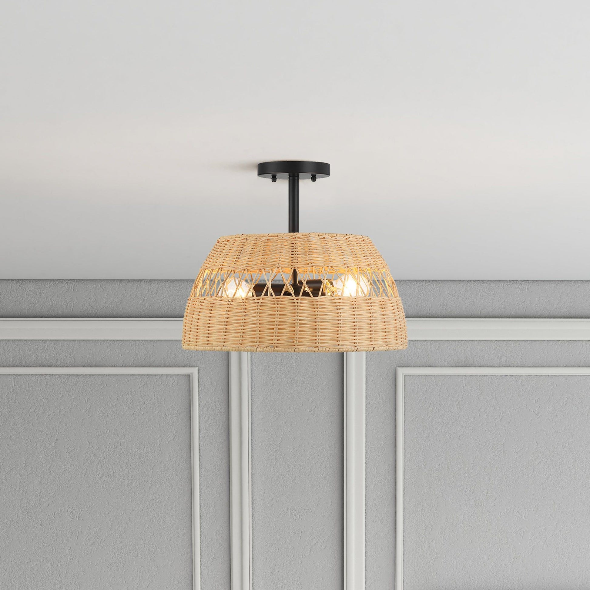 • Farmhouse Style: The Twinkle Double Lights Semi Flush fixture combines a black metal finish with a rattan shade, offering a rustic charm that enhances farmhouse-style décor.