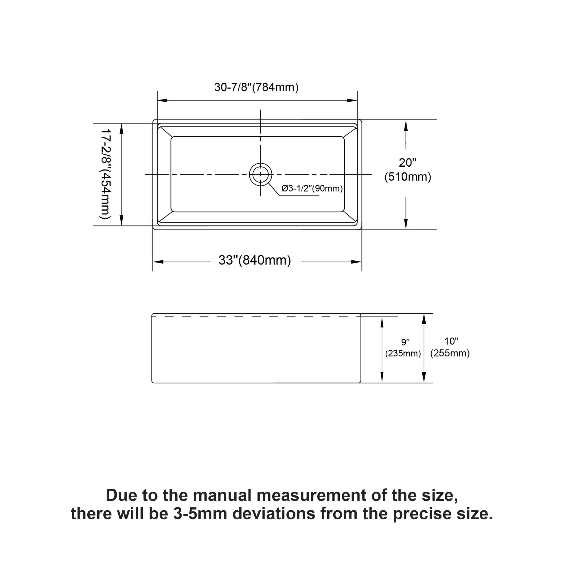 - Stylish Deep White Kitchen Sink Size: Measures 33 x 20 x 10 inches with a standard 3-1/2" drain for compatibility with common disposal units.